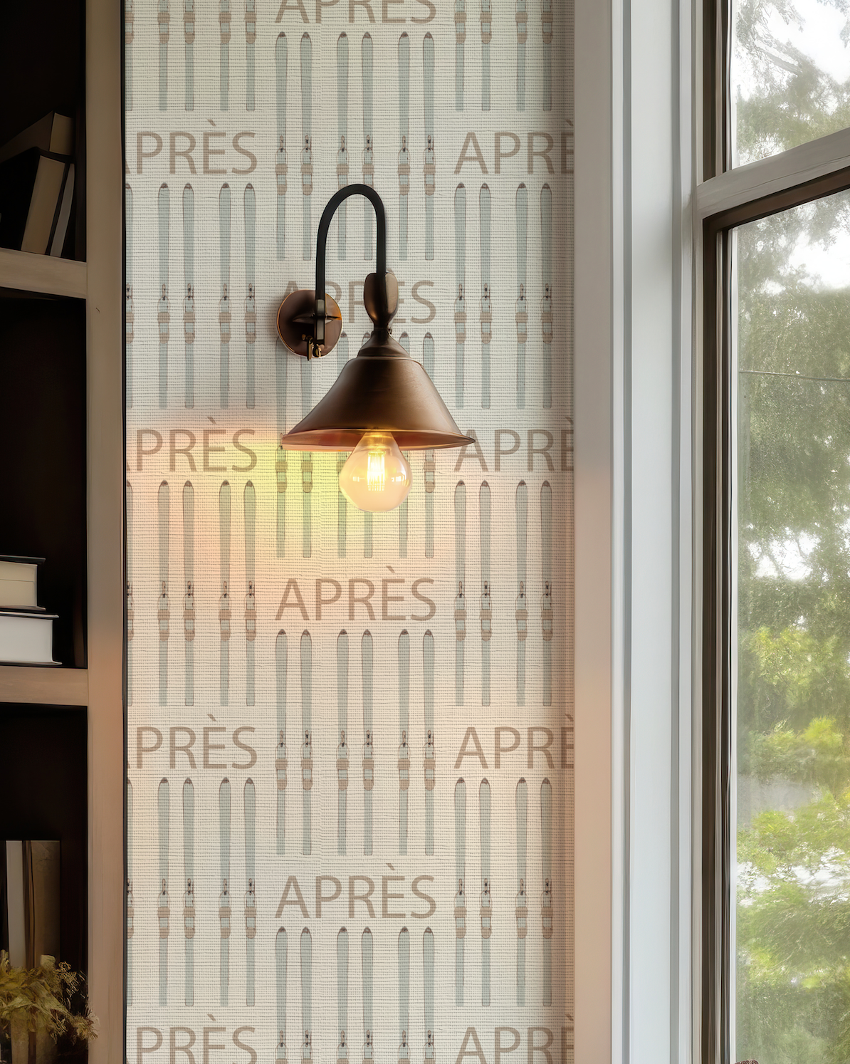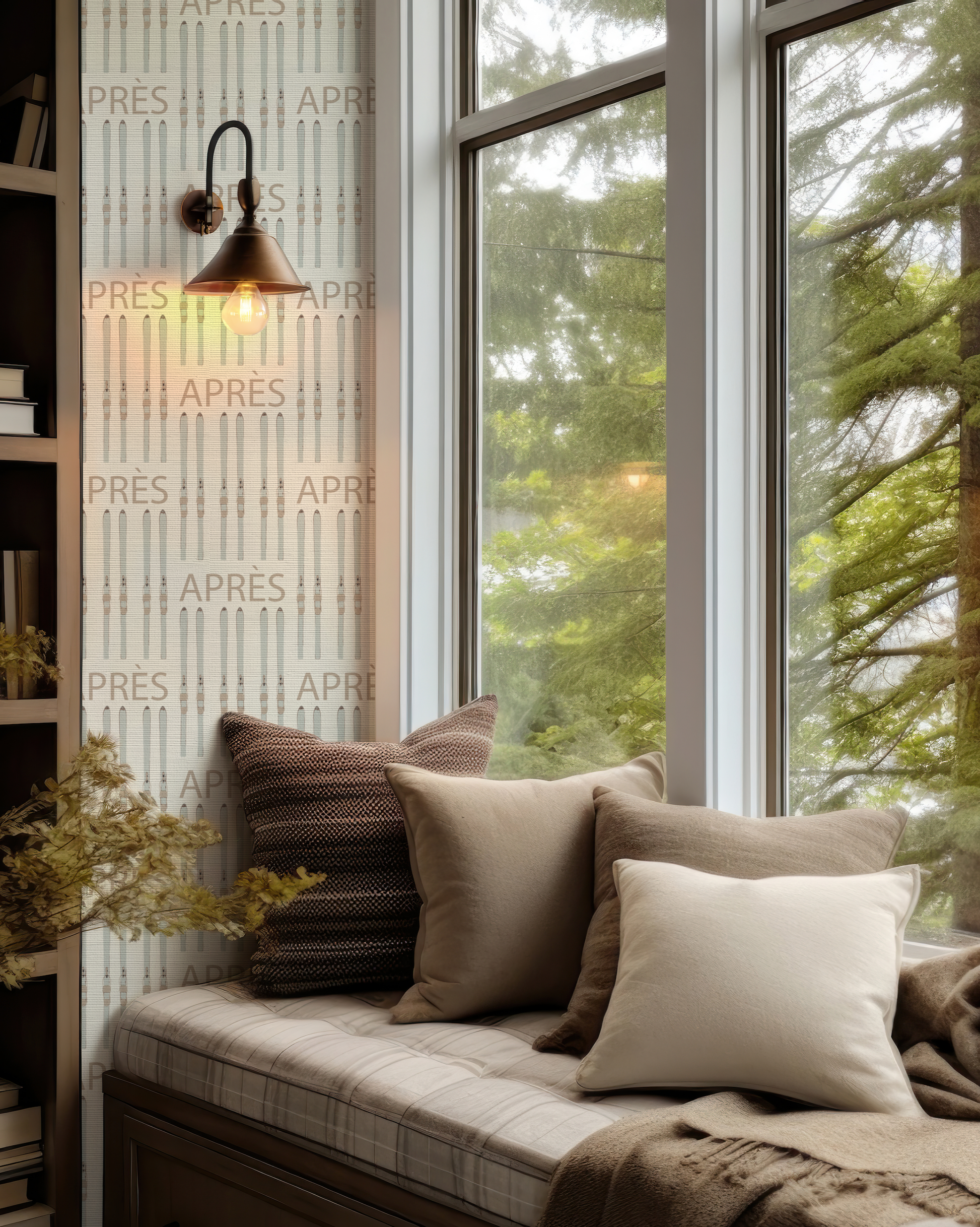 Bring a touch of mountain elegance to your space with our Après Ski wallpaper by Alpen Haus. This motif features hand-drawn skis in a geometric pattern printed on a creamy off-white wallpaper for a warm yet contemporary look. It's accented with a well-beloved ski phrase in a modern typeface that catches the eye and invites the après joy to stay.