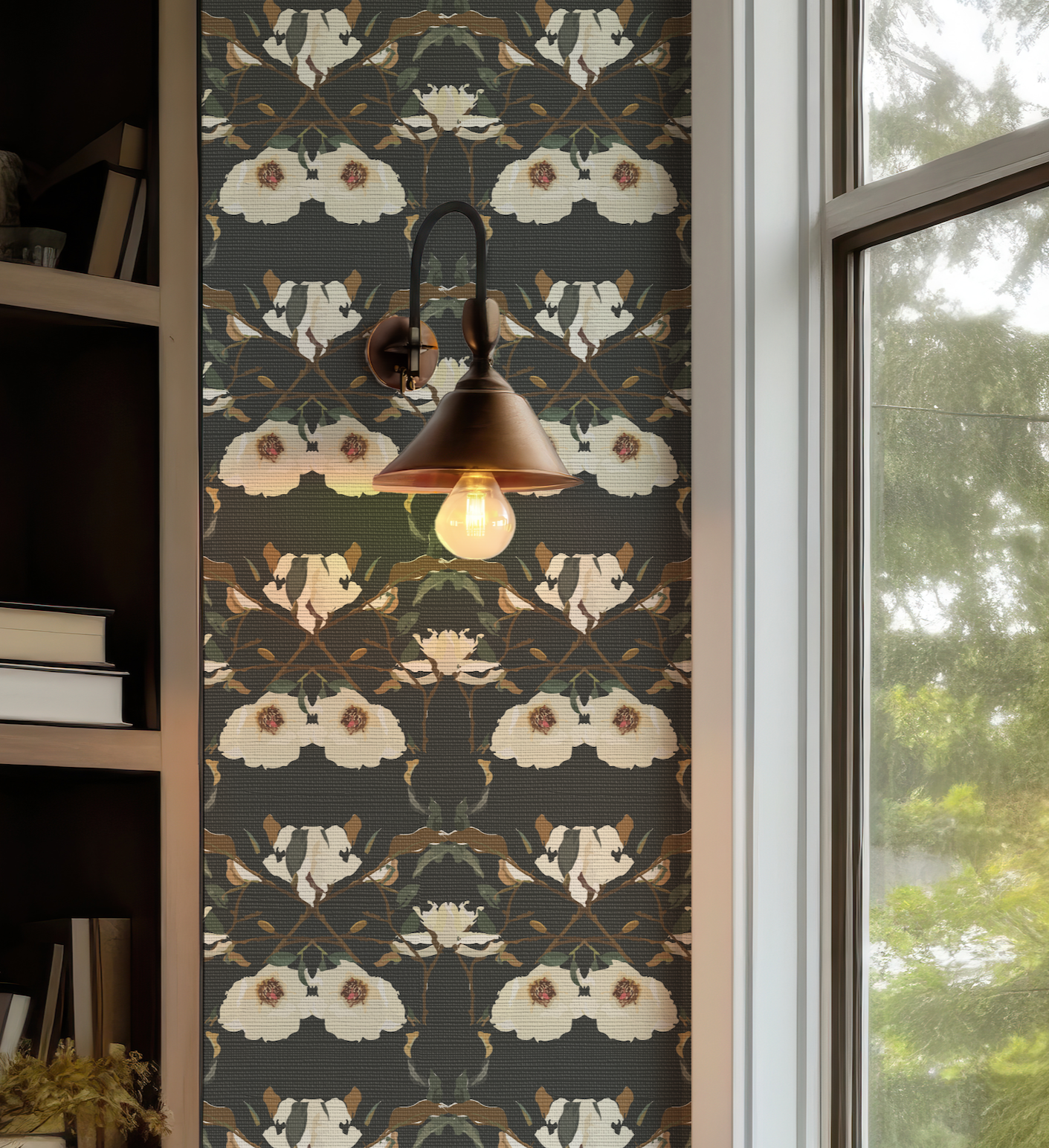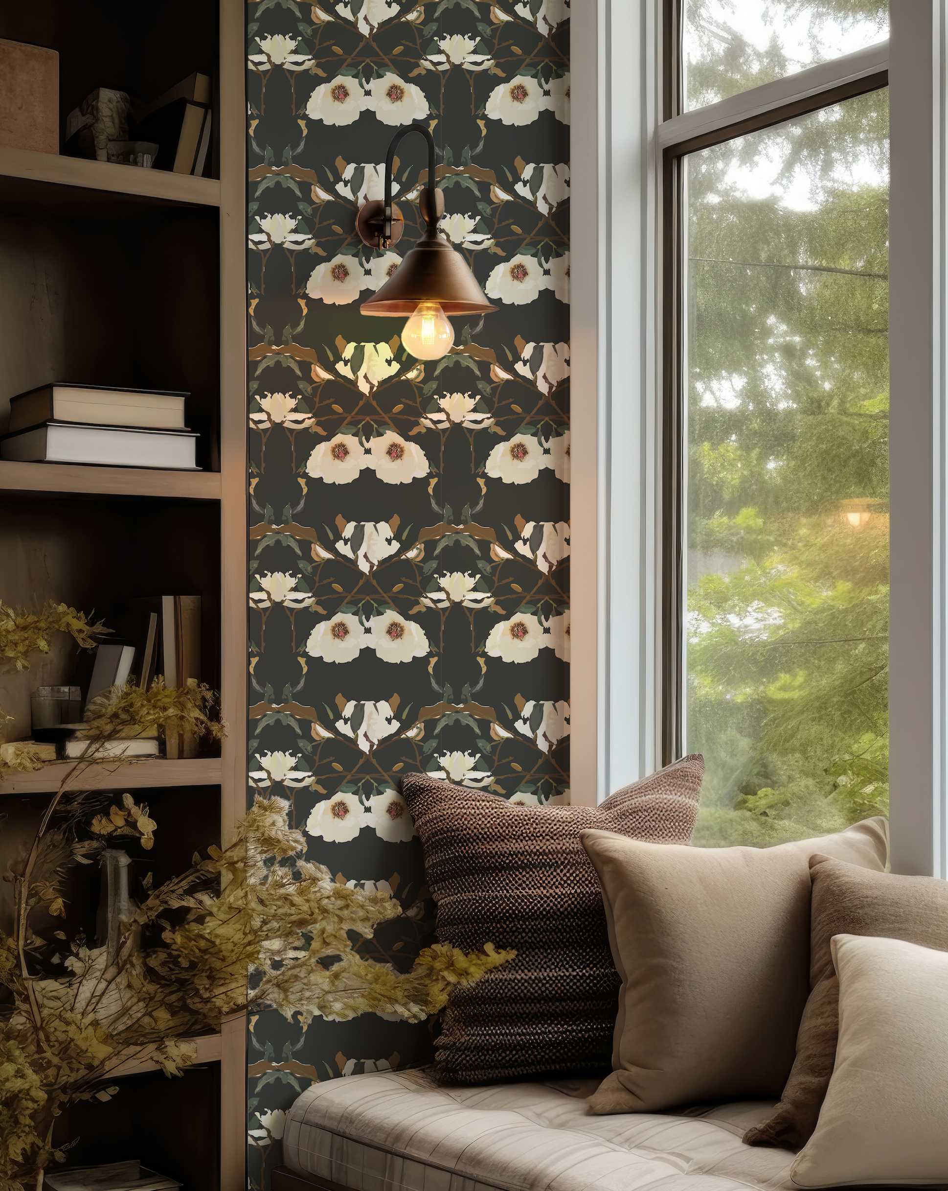 Transform your home with this gorgeous hand painted Magnolia on Black Wallpaper. The delicate shades of off white and tan make for an eye-catching contrast against the black background. Perfect for creating a calming atmosphere. Add a touch of artistic flair with Willow+Wild!